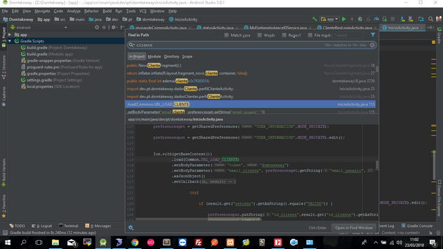 Abra seu Android Studio e para localizar uma classe ou qualquer código dentro do seu projecto pressione do lado esquerdo"ctrl+shift+f" então vai abrir a seguinte tela pesquise e vai clicando sobre cada um ate encontrar o que você deseja, para abrir de um duplo clique.