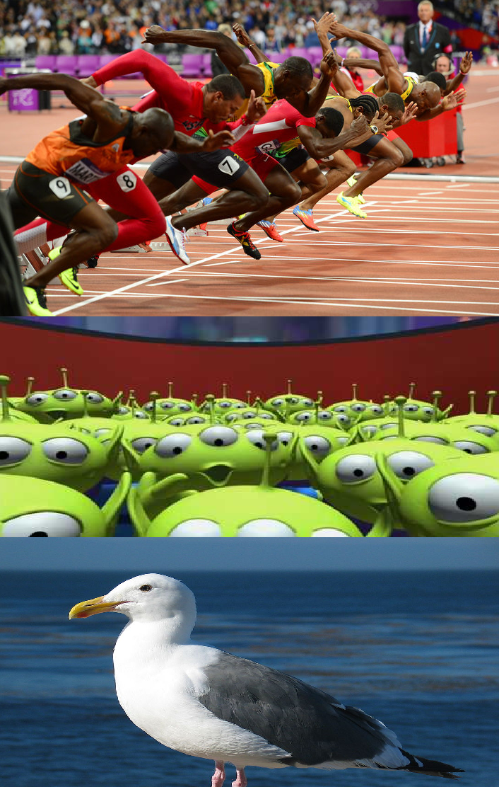 Clue: Think about what someone might be saying when the first image was took, what the green people (or aliens/toys) say and what the last thing is.