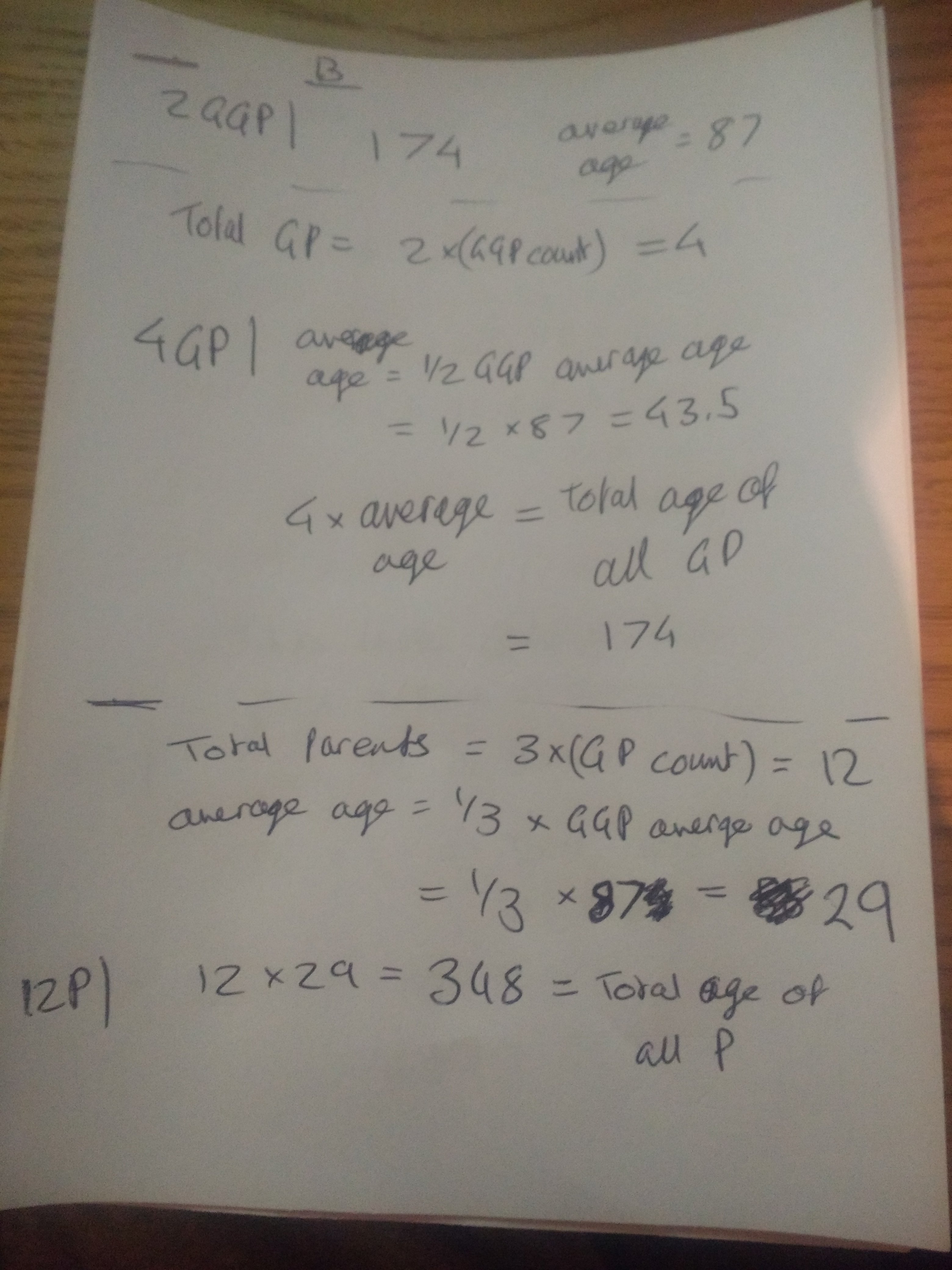 Family B has two great grandparents with a combined age of 174. They have 2 children each with an average age half that of there parents average age. These grandparents then have 3 children each with an average age 1/3 of that of their grandparents average age. These parents have 2 children each at an avenge age of half of theirs. Only half of these children have children themselves with an average age of 5.