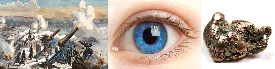 I can't get anywhere with this. First should be battle/war/cannon, second should be eye/look/see and the last one is most certainly copper (or maybe just ore). Something ending with cop? I was thinking the first might be private (the military rank) but that would be a huge stretch and 'private eye cop' doesn't even make much sense, since you're most likely one or the other but not both, lol.