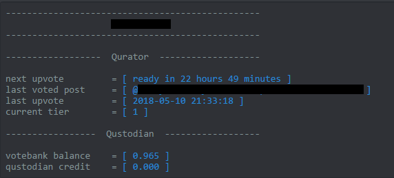 From then on, @qustodian will check your votebank balance at that day. If you have a votebank balance of 0.4. @qustodian will deduct 0.4 from your qustodian credit(You send in 1SBD, so you have 1SBD as credit in this example) and will upvote your latest post with 2.65 times the value of the deducted amount.