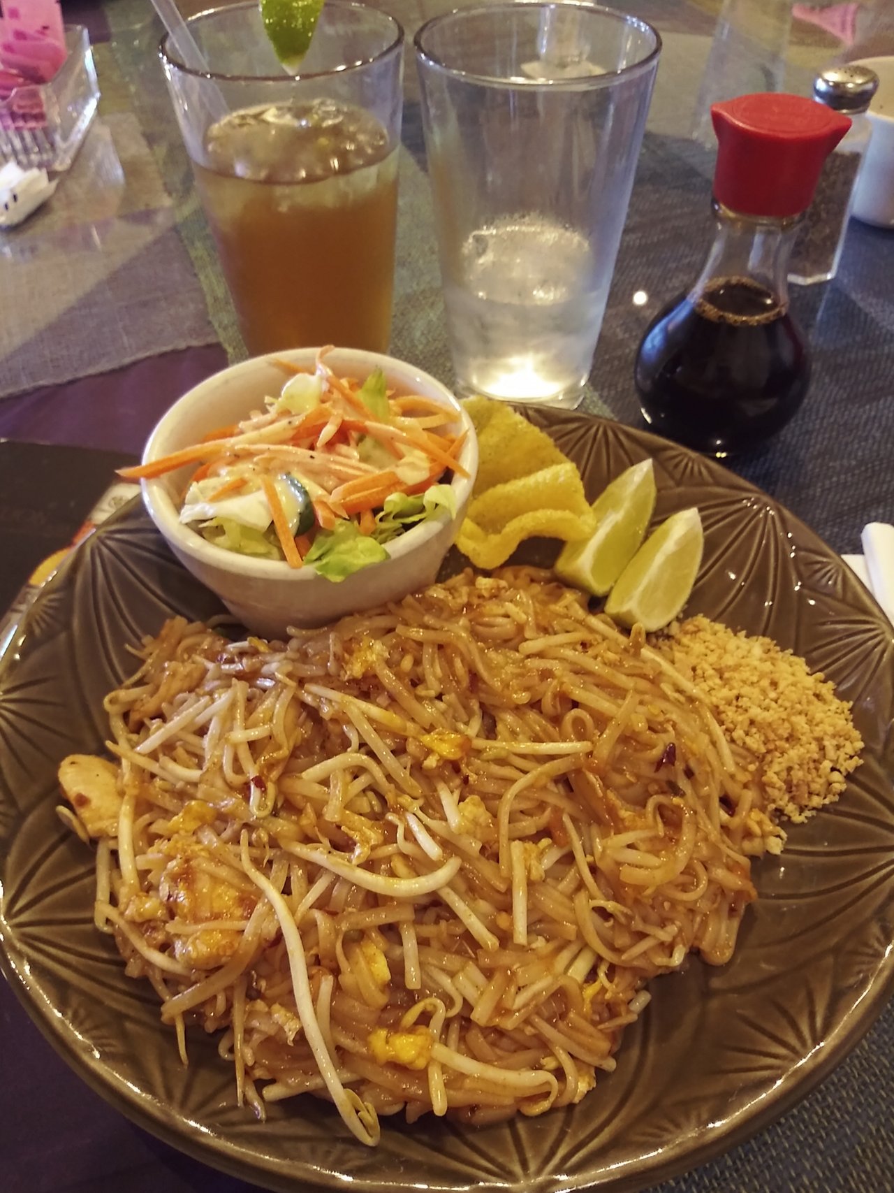 I had their yummy Chicken Pad Thai with peanuts, soup, salad, tea, limes, and a chip like treat that I didn't get the name of. All that food for $8.95 lunch special.