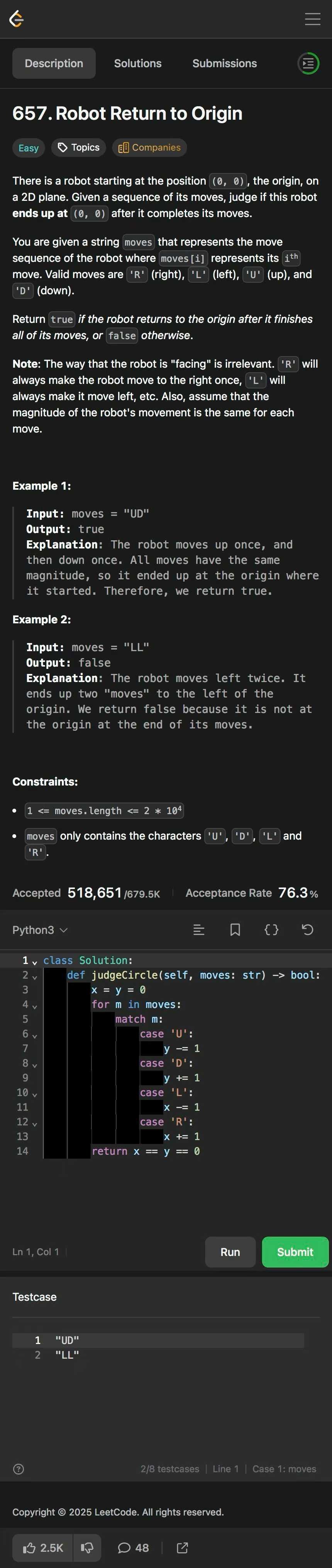 | 带娃刷题第259天 机器人是否能回到原点 |