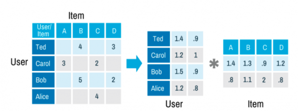 그림의 출처는 이곳입니다. 예시입니다. User와 Item 벡터곱으로 Ted가 아직 보지 않은 A아이템을 2.68만큼 선호할 것이라는 예측을 할 수 있습니다.