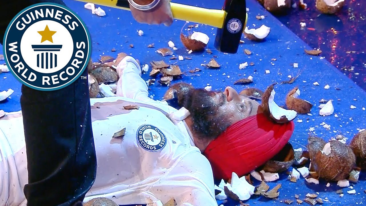 some of Guinness records likely make you scratch your head and wonder how that's even a thing watching Karim Jeet and koalas Jeet Singh record-setting event is one of those times the to set a record for smashing those coconuts around a person in one minute while blindfolded yes well one person lay on the ground surrounded by coconuts the other used a sledgehammer to smash the fruit I'll be unable to see a thing oh and in case you were wondering the record stands at 35 coconuts