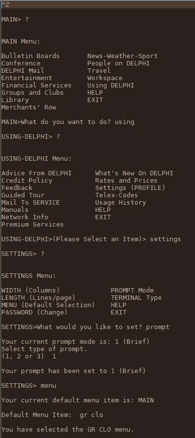 This post includes the contents of MENU.DOC which is dated September 24nd, 1985. While perhaps not as interesting as some other files, this one does contain a little insight into how Delphi operated. This is a screen capture of going through and configuring a couple of menus. The more commands you could memorize, the shorter you could make the menus which was a big deal when you were communicating at 2400bps or less (more likely 300bps or 1200bps in 1985).