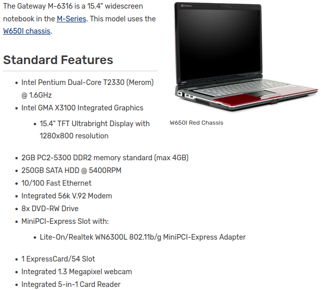 The Gateway M-6316 I am looking at here has the following features: