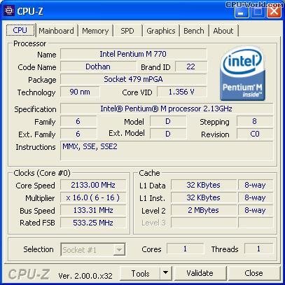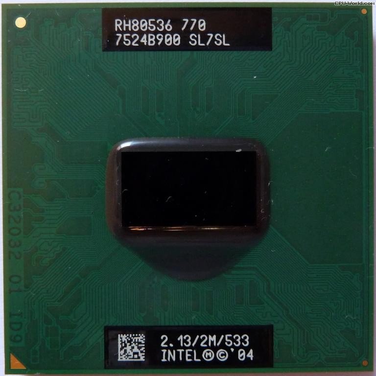The CPU is a 2.13 GHz Pentium M 770. This is one of the fastest Pentium M CPUs. It generally matches the speed or comes close to the fastest Core Solo CPUs as well. It clocks in at 2.13 GHz with a 533 MHz bus and 2 MB L2 cache.