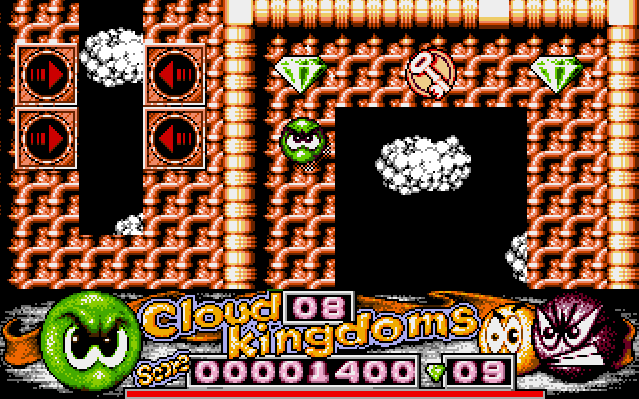 'Cloud Kingdoms' again, on the Atari and Amiga, has pretty good graphics and a nice atmosphere. Its sound effects are serviceable and its intro 'and' pause music are both awesome. It 'is' a little lacking in music during game stages - but I personally don't mind this... and if memory serves well it can be toggled anyway.