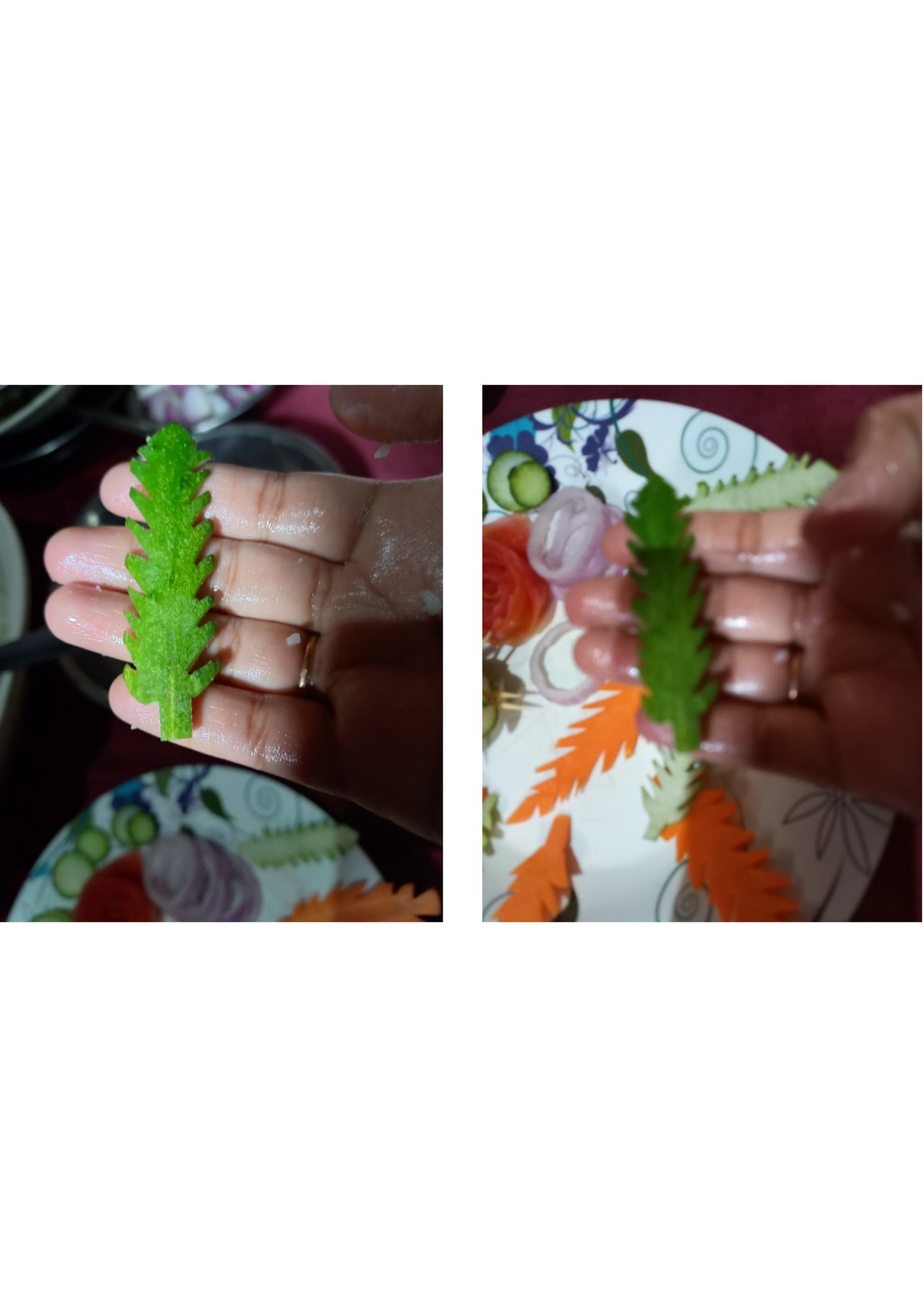 - প্রথমে আমি গাজর কে পাতলা করে কেটে নিয়ে ,এভাবে কেটে কেটে পাতা ডিজাইন করে নেব।