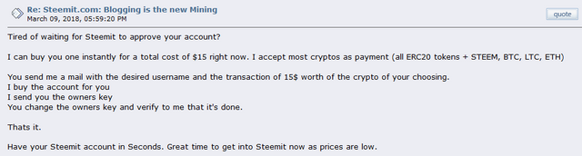 This is of course a widely known issue. But it strongly limits the capacity of Steemit evolution to a new age social media platform. Accept it or not, numbers are what ranks a social media platform. And on Steemit, we haven't been able to make the onboard faster. In fact if you see the Bitcointalk thread of Steemit, you will find a lot of people complaining about this. There are some opportunists as well, who offer these kind of services under the given conditions.