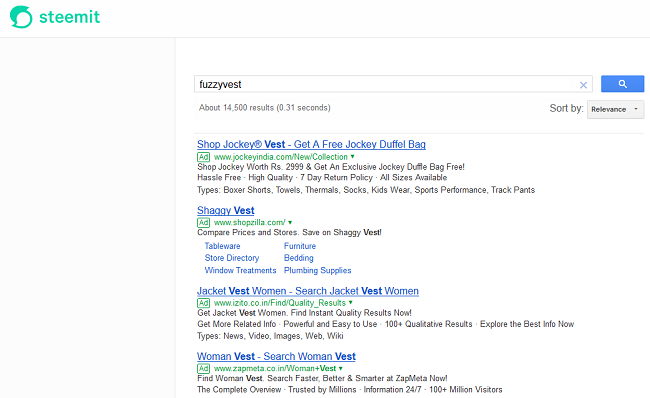 Don't you think Google search is a big misfit on Steemit. Steemit is basically an ad-free platform (at least till now), but then why do I get these results when I search for "fuzzyvest"!!