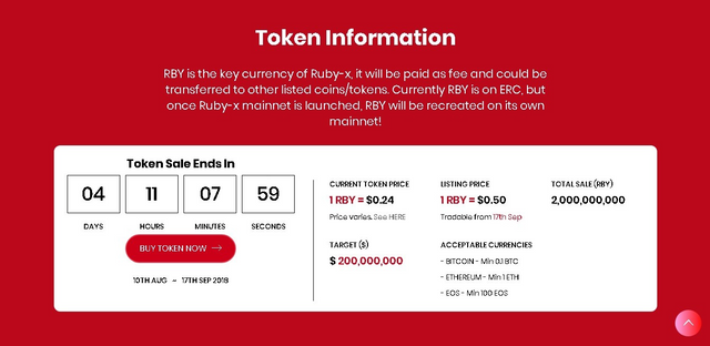 Token alımı için son 4 gün 11 saat kaldı.Üstelik 1 RBY için $ 0,24 ödeyeceksiniz ve bunun satış fiyatı 17 eylül itabiriyle $ 0,50 olacaktır.Yatırım olarak BTC,ETH ve EOS para birimi üzerinden yatırım yapabilirsiniz.Toplamda 2 milyar token satışı olacaktır.Eğer sizde yatırım yapmak isterseniz https://token.ruby-x.io resmi web sitesi üzerinden token alımını gerçekleştireceksiniz.Tokenlerinizi neredeyse 2 kat fiyat ile Ruby-'in kendi borsası üzerinden neredeyse 2 kat fiyatla satabileceksiniz.