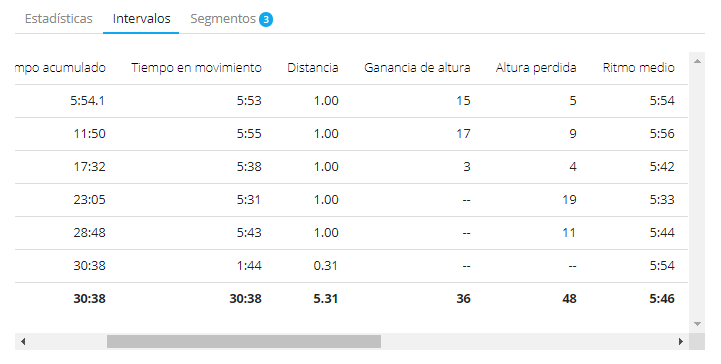 Para acabar el post y la redacción de este entrenamiento en Steemit, aquí están las estadísticas por kilómetro. Todos los kilómetros fueron por debajo de 6 minutos. El kilómetro más rápido fue el que más altura perdida tuvo, el kilómetro 4, con una pérdida de altura 19 metros y un ritmo de 5 minutos y 33 segundos por kilómetro.