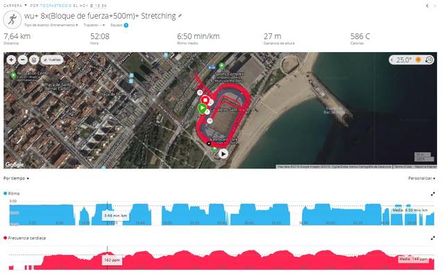 Today I did another "spartan" heavy session of 8 blocks of Force Exercise in which I combine repetitions of a Force exercise on a particular group of muscles of the lower extremities with Force exercise with another group of muscles (calves, quadriceps, Isquiotibials...) , this time from the upper body (arms, legs, abdominals...), followed by a "transfering" run of 500m long, done at fast pace.