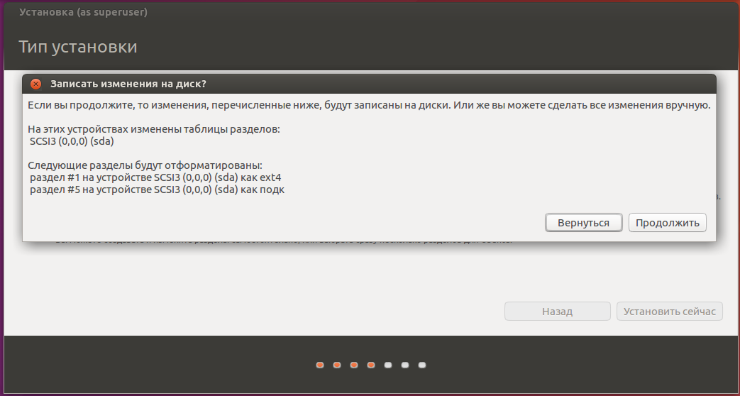 After we've finished with disks, partitions and partitioning - click "Install Now" and proceed to the next window, where the installer warns you that if you continue now, the changes you've made will be written to the disks and you can't undo them anymore. Agree, or go back and double-check if you think you might have made a mistake somewhere.