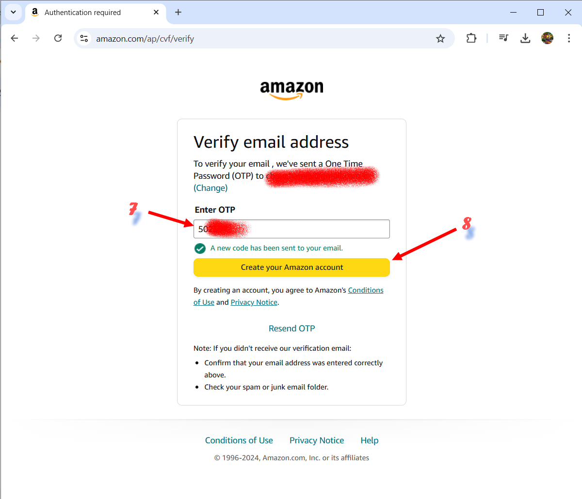 Step 5: Amazon sent me a verification code via email. I entered this code OTP in the designated field to verify my email address.