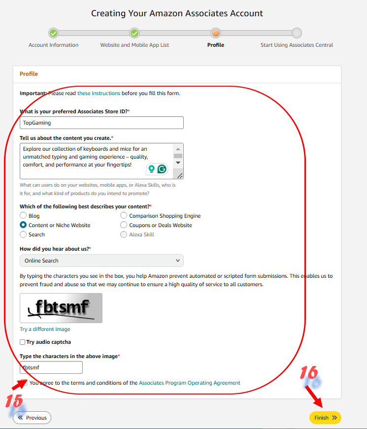 Finally, I clicked Finish to complete my registration and create my Amazon Affiliate account.
