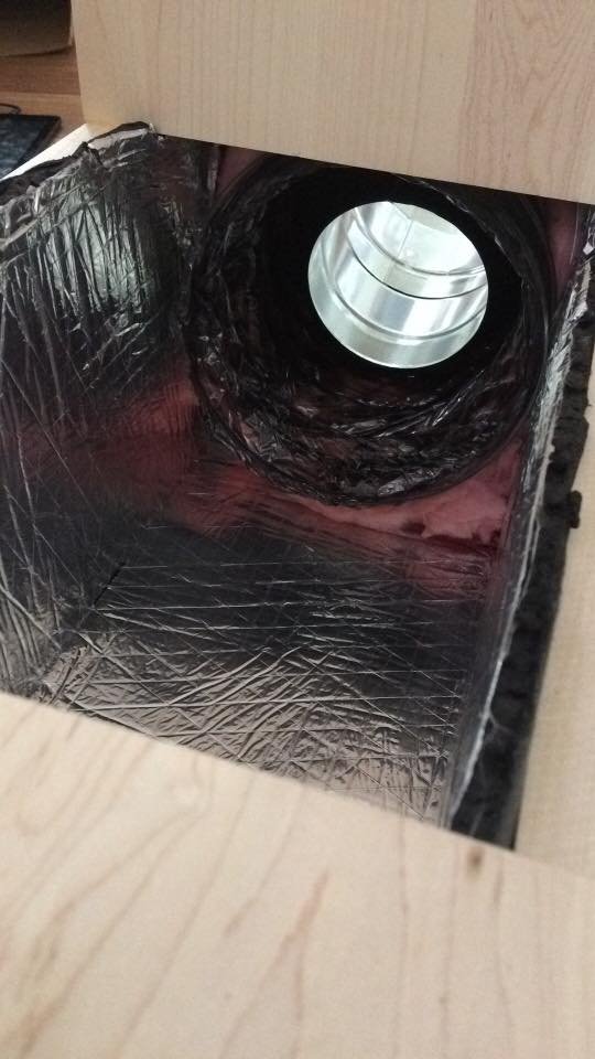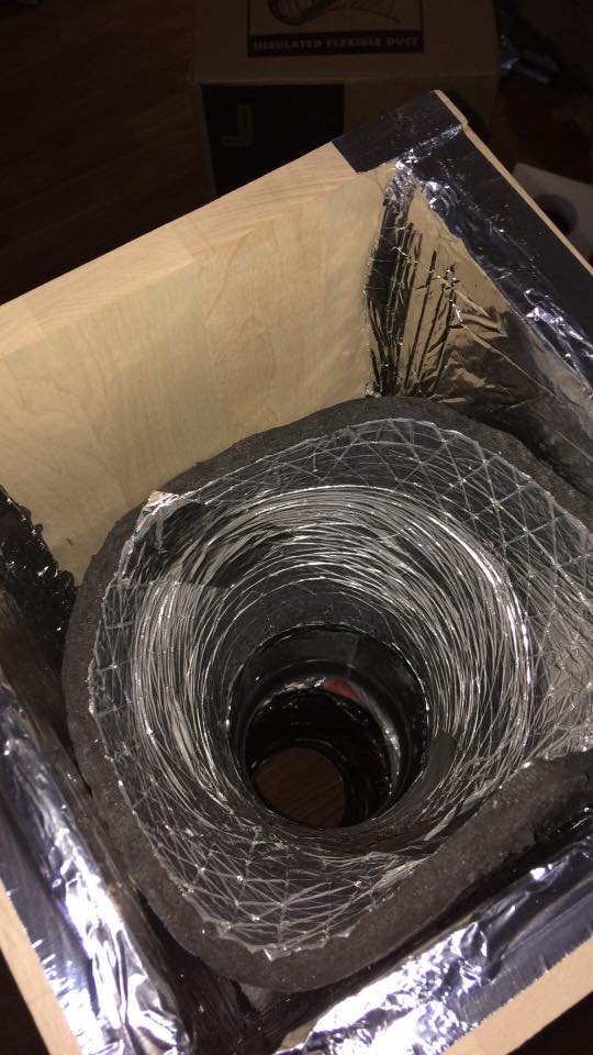 This box is made out of HardWood Maple, Then i put Sound Deadner inside that, and then i put 8" insulated Flexduct, and then to some 8 to 6 and 6 to 5 reducers to get to some 3D printed exhaust addons. I placed them on the intake and the exhaust, the intake side had an 8" Dust guard on it.