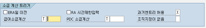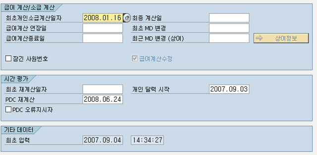 인포타입 속성을 유심히 본 사람이라면, 'ERA 이전일'이라는 필드를 확인했을 것이다. 간혹 최초 소급 계산일자 이전의 발령이나 조직 지정 정보를 수정해야 하는 경우가 발생한다. 그럴 때는 최초 소급 계산일자를 지우고 해당 데이터를 입력하고, 다시 설정 후 최근 MD 변경일자도 원래 데이터로 맞춰야 할 것이다. 하지만, 이런 식의 데이터 변경은 적절치않고 대량의 데이터인 경우에는 원치않은 소급을 발생시킬 수도 있을 것이다. 물론 100% 완벽한 방식은 아니더라도 ERP 이전일에 대한 체크와 과거 엔트리 허용에 체크하면 최소한 최초 소급 계산일자를 지우지 않아도 과거 데이터에 대해서 변경이 가능하다. 다만, 최근 MD 변경일자의 날짜는 최초 소급 계산일자와 같아진다(PM01에서 확인할 수 있다.).
