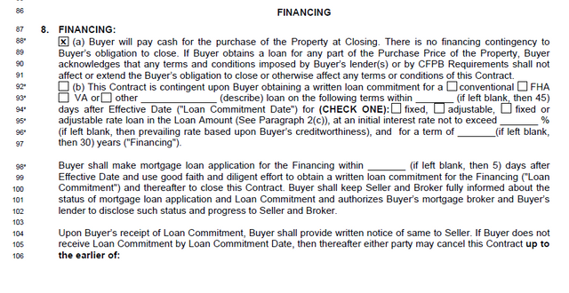 This is further down the contract and tells the seller whether you are paying cash or using financing. When using financing it is vital you select as the deal becomes contingent on it. If your financing falls through, you are off the hook and your deposit is returned. Otherwise you would lose it.