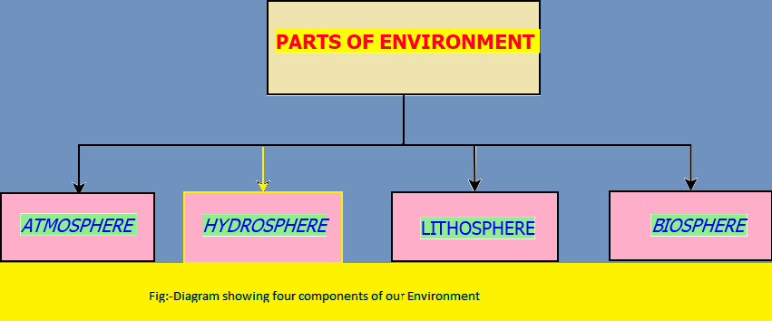 Our Environment consists of four parts- Atmosphere, Hydrosphere, Lithosphere and Biosphere, which we will discuss briefly.