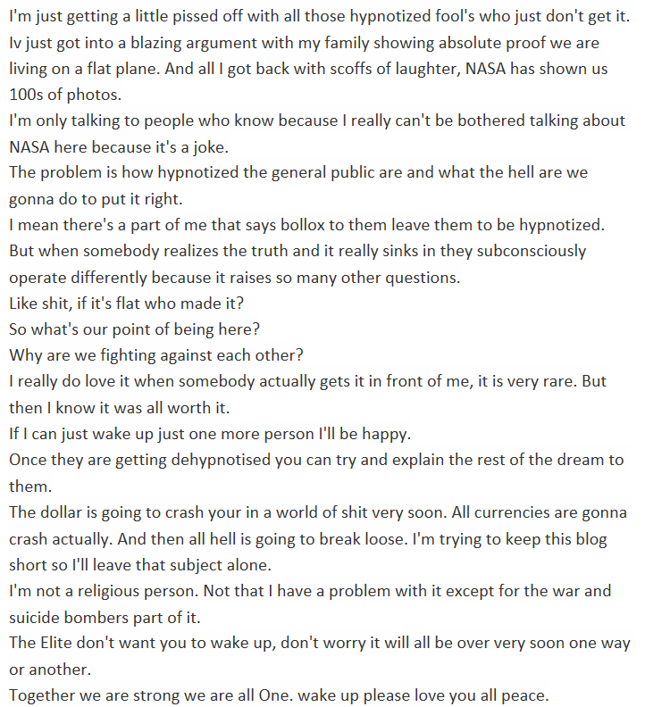 I'm just getting a little pissed off with all those hypnotized fool's who just don't get it. Iv just got into a blazing argument with my family showing absolute proof we are living on a flat plane. And all I got back with scoffs of laughter, NASA has shown us 100s of photos.