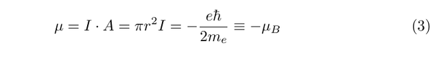 v = |v| is the speed, and r is the radius or the orbit. The magnitude of the angular momentum of the electron is given by mvr, and since angular momentum is quantised, it is the case that in the ground state, this quantity must be equal to h/2pi (hbar). We may, therefore, write the magnetic moment as