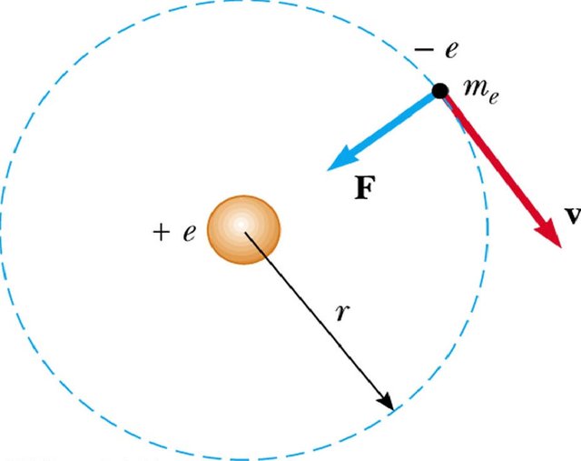 We can quite easily estimate the size of an atomic magnetic moment, and from this, we can deduce the size of the gyromagnetic ratio. As shown in the diagram below, imagine an electron (which has charge -e, and mass m_e) that is circularly orbiting the nucleus of a hydrogen atom. The current around the atom is