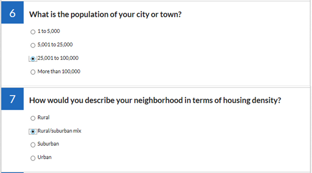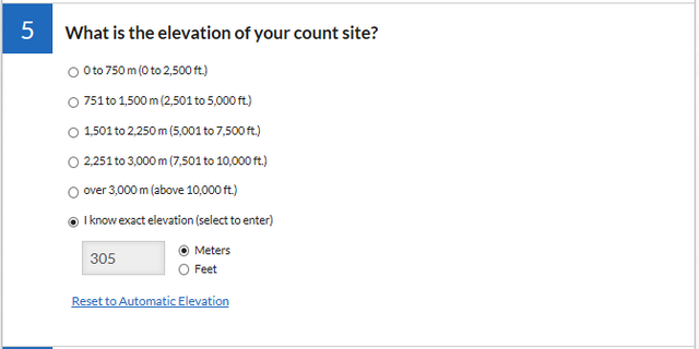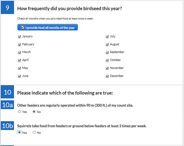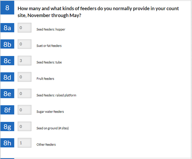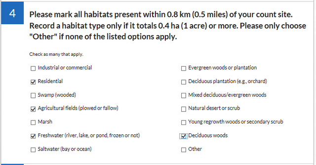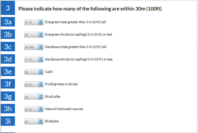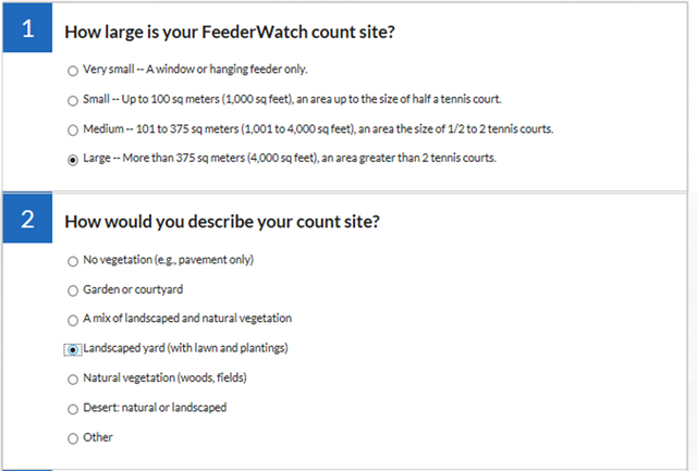 The first two questions describe the size of your bird watching area and the type of area it is.