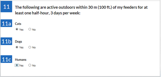 The final question asks you to describe whether cats, dogs, and humans are active in the area.