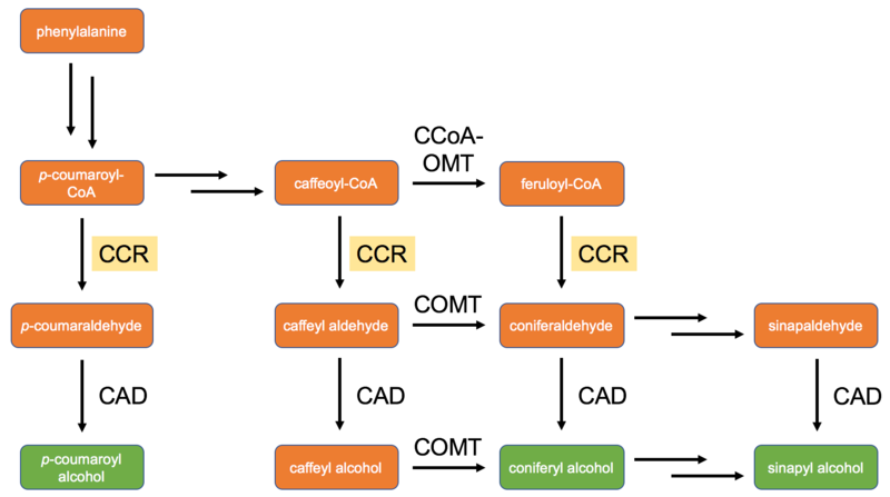[Monolignol biosynthesis model for land plants showing three most common lignin monomers shown in green. Credit: Wikimedia. Creative Commons Attribution-Share Alike 4.0 International license. Author: Bjschul7]