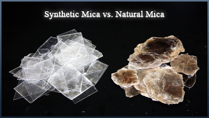 Base on chemical formula, mica contained potassium element, where each potassium ion (K+) can prevent swelling and hold water molecules. Outwardly, the natural and synthetics mica have the difference, in which the natural mica was yellowish and contained potassium and aluminium compounds, while synthetic mica contained potassium and magnesium (Mg3+) compounds, so the color synthetic mica looks a bright white.