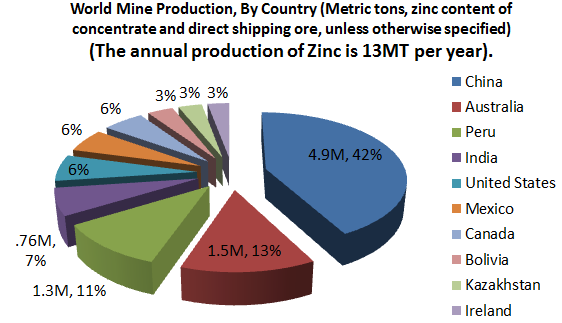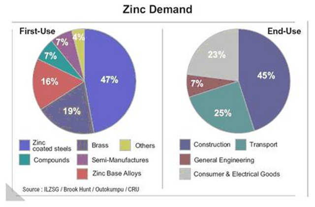In this graph, we will see how the Zinc utilized in the industrial perspective. It is divided into two use, the first use and the end use. 47% of Zinc are utilized in zinc coatings like zinc galvanize in the first use. While in the end use, it is still used mainly in the coatings and a quarter of Electrical goods and transport.