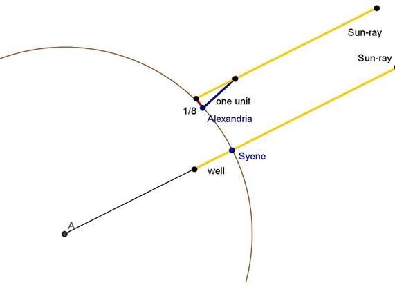 From his readings, Eratosthenes knew that on the day of the summer solstice, sunlight fell directly into a very deep well in Syene (now Aswan), Egypt. On this day he measured the shadow of a pole in Alexandria. He found that the sun's rays made an angle of 7.2°. Knowing that 7.2° is 1/50 of a circle, he multiplied the distance ( which is 5000 stadia or 925 km) between Alexandria and Syene (925 km x 50 = 46,250 km).