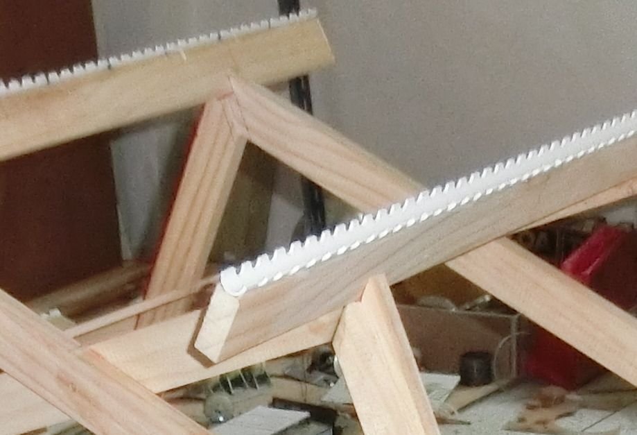 To hold the wires in place, I use a 15 mm PVC pipe, drill holes in it at the right distances and then cut the pipe across its length in two, giving two half-pipes with indents for holding the wire. This is glued onto the wooden frame.