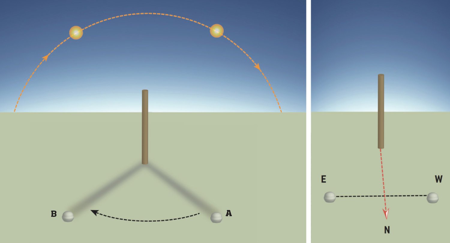 - Draw a line connecting these marks. This runs west to east, so you can now work out where north is.