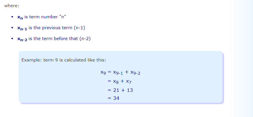 The Fibonacci sequence is a series of numbers where a number is found by adding up the two numbers before it. Starting with 0 and 1, the sequence goes 0, 1, 1, 2, 3, 5, 8, 13, 21, 34, and so forth. Written as a rule, the expression is xn = xn-1 + xn-2.
