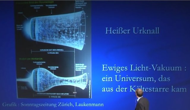 Christof Wetterich talk in pictures. The best know picture is the “Success Story” Big Bang Theory. In the beginning there was just about nothing. Out of the primordial fluctuations in the vacuum arose an explosive expansion which we call the Inflation phase. Approx. 10 to the 30th and 10 to the 40th seconds.