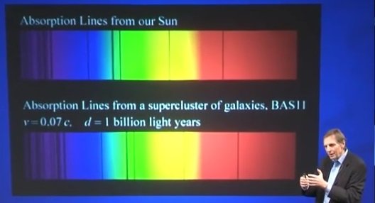 Bottom: The presumption is the farther an object is away the longer it took to get here. Presuming the light left with the same wave length, then space would have to expand so as to lengthen the light which causes it to wander toward the right in the spectrum. The red shift is proportional to the distance of the object. Red shift v=0.07c is equal to a distance d=1 Billion light years. We have now measured the expansion of space during this period of time.