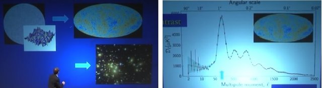 Image 2: Left: Primordial fluctuations leads to expansion which we can measure as the Cosmological Background Radiation with Temperature swings as little as +- 1/1000th of a degree. In the next phase the Universe would develop farther so that stars and galaxies could form.