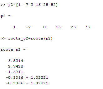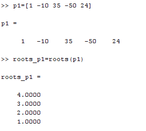 Find the root by following two commands. We denote a polynomial such as p1 and its roots with roots_p1.
