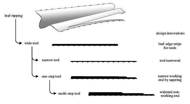 Hunt & Gray (2003) argues that the tool-making of the Caledonian crows is an example of cumulative culture and what Tomasello calls ratchet effect, that is, that the tools are modified, developed and improved progressively over time and across generations; an effect that is not possible without culture or social learning. Without the existance of social groups, no transfer of knowledge is possible, including tool manufacture. We would be back to square one, so to speak, and would have to use trial-and-error to manufacture a stone ax. Whiten & Boesch (2001) claims that each generation would have to "reinvent the wheel" if it was not for cultural transmission. When it comes to the crows of New Caledonia Hunt & Gray (2003), refer to the cumulative development and diversification of pandanus leaves (see picture).