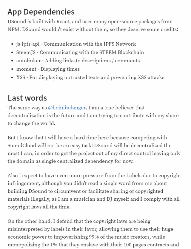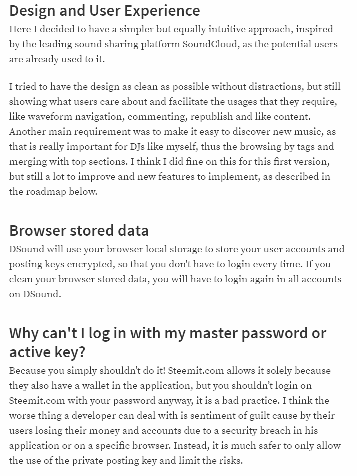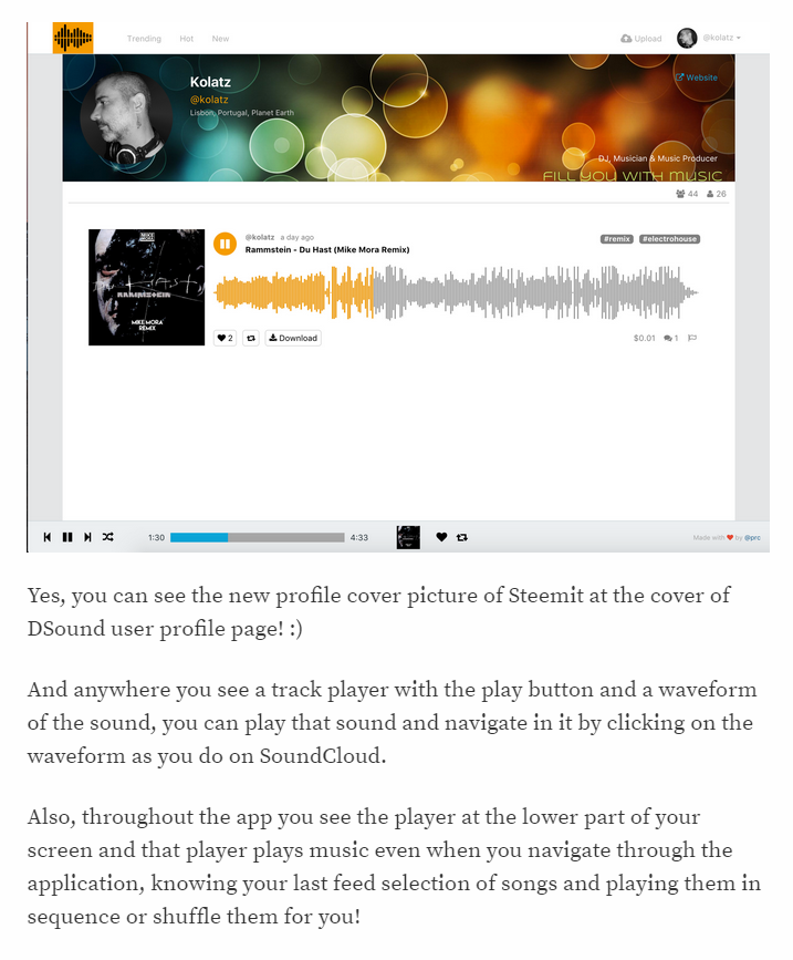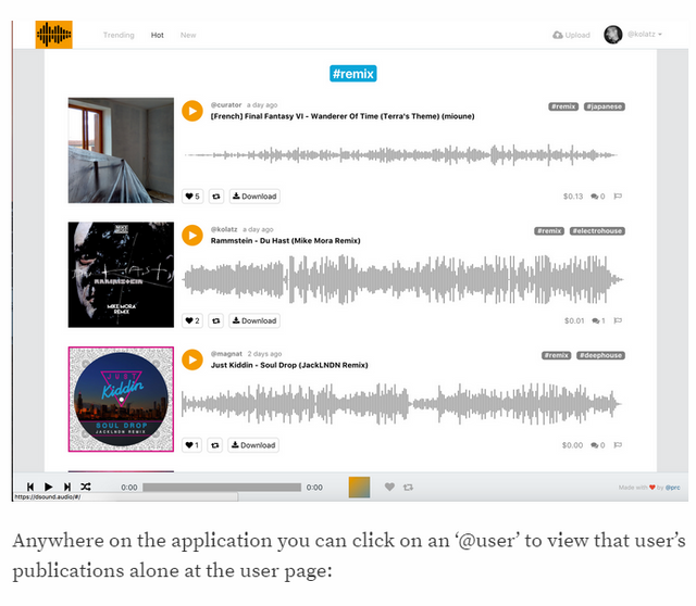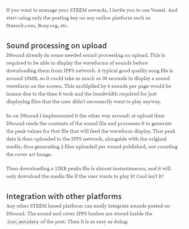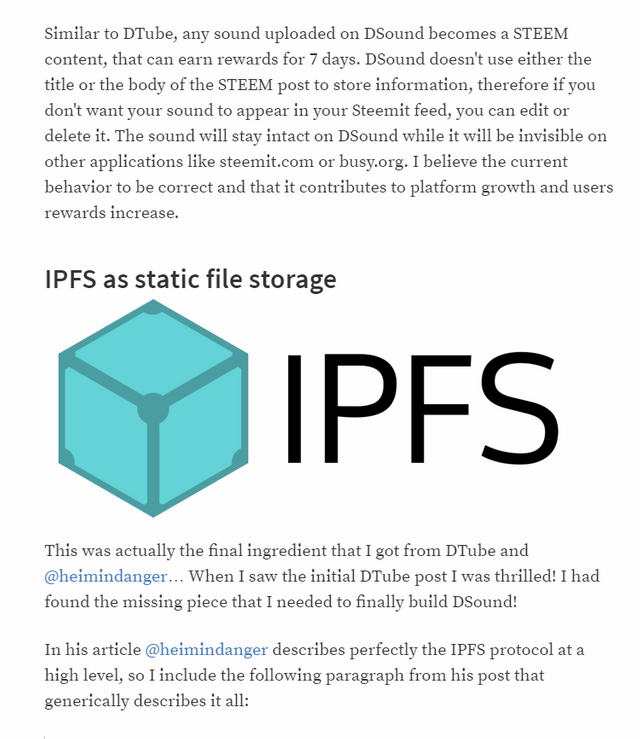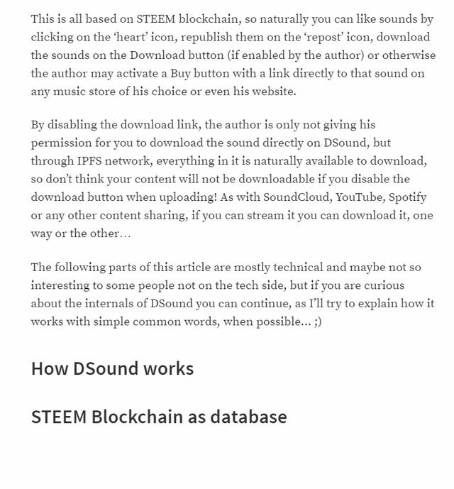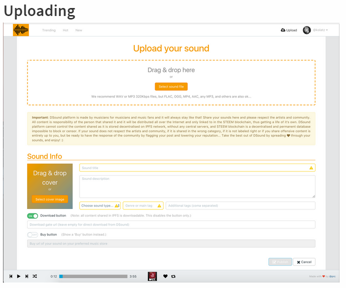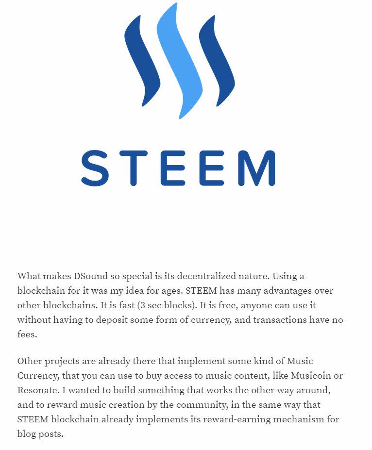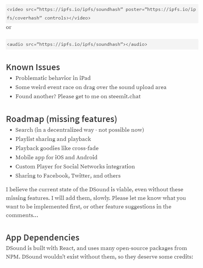 DSound is a web application that I created in Javascript, that enables us to transfer, tune in and find music and different sounds put away over the IPFS Network. It utilizes STEEM blockchain as a decentralized database, which enables creators to win compensates in STEEM Dollars digital currency, which can be traded specifically to US Dollars or whatever other money, when different clients like or repost our substance, similarly as Steemit.com for blog entries.