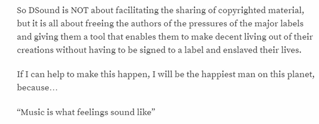 Along these lines, the copyright law is broken and needs settling. However, in these last cases, other than being reasonable utilize, the industry is mishandling the little makers with their super-powers making it unthinkable for them to make due without working different occupations to put nourishment to their tables, rather than concentrating on making and spreading love! Yet, this is going to change with DSound!!! :)