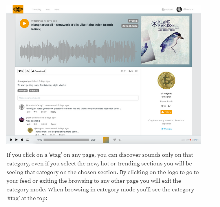 Here I endeavored to imitate the way Steemit.com works, except for the landing page where you see the bolster of sounds that had any current cooperations, similar to remarks or upvotes. At that point you have the general Trending, Hot and New primary segments. They work the same as in Steemit.