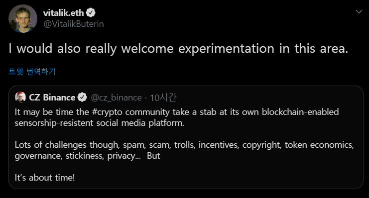 한 유저는 비탈릭의 이러한 트윗에 "당신의 강력한 라이벌이라고 할 수 있는 블록원에서 이미 1년 전부터 이러한 특성을 가진 소셜 미디어를 구축하고 있는 중이다"라는 의견을 남겼는데, 비탈릭이 본인도 베타 서비스 신청을 했다며 하루 빨리 실제로 만져보고 싶다는 개인적인 기대를 내비치기도 했습니다.