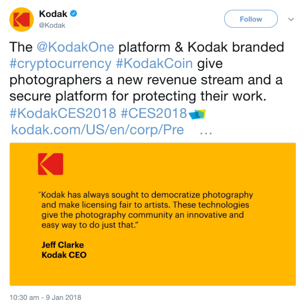 이미 2018년 1월에 KodakOne Platform과 자체 브랜드인 KodakCoin에 대한 발표를 했었는데, 그 당시에는 흘려 들었었는데, 1년 정도가 지난 지금, 뉴스 기사로도 나오는 걸 보니, 이제 본격적인 시작이 이루어지지 않을까 생각합니다.