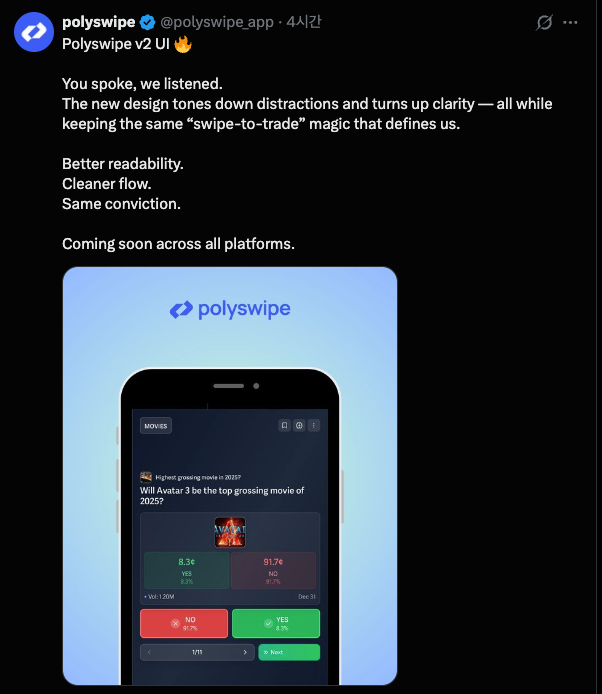 폴리마켓 데이터를 마치 틴더하듯이 스와핑해서 투자하는 방식이다.