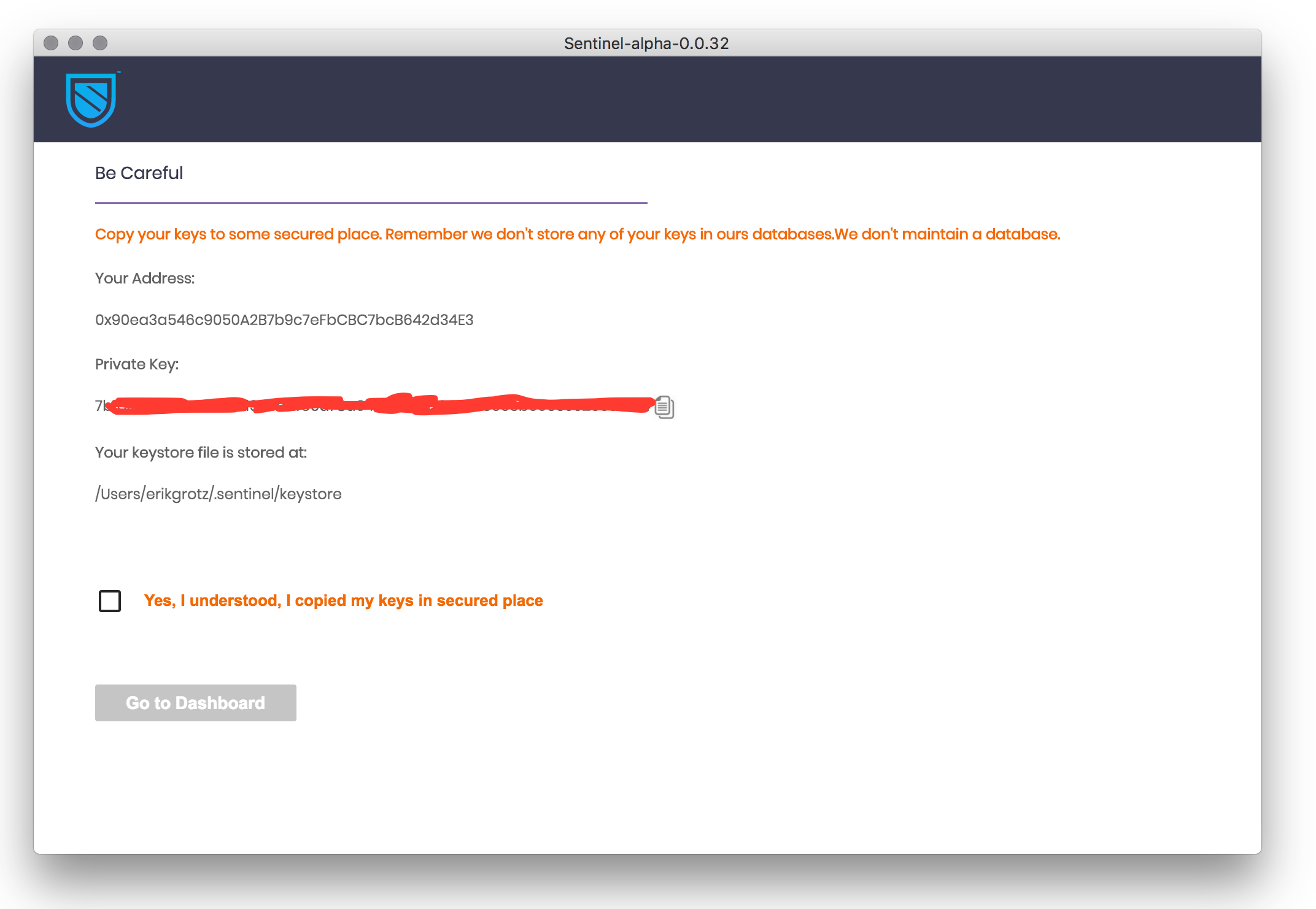 - Step 9. The next screen shows you your address, private keys and location of your keystone file should you need to restore the wallet. Once key/wallet is copied, click yes and continue to dashboard.